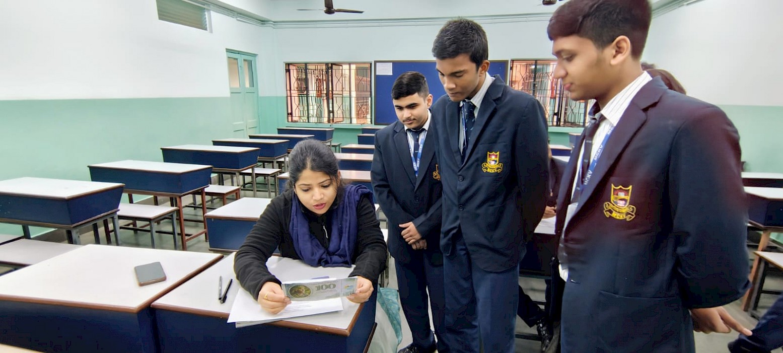 Students of Class 11 showcased their currency designs before peers and teacher evaluators on 9 January 2026. Each currency note reflected key elements of Eldoria—natural landscapes, national symbols, influential leaders, cultural traditions, and technological progress. Attention was also given to security features such as holographic strips, along with colour schemes, materials, and size variations to ensure usability and visual appeal.