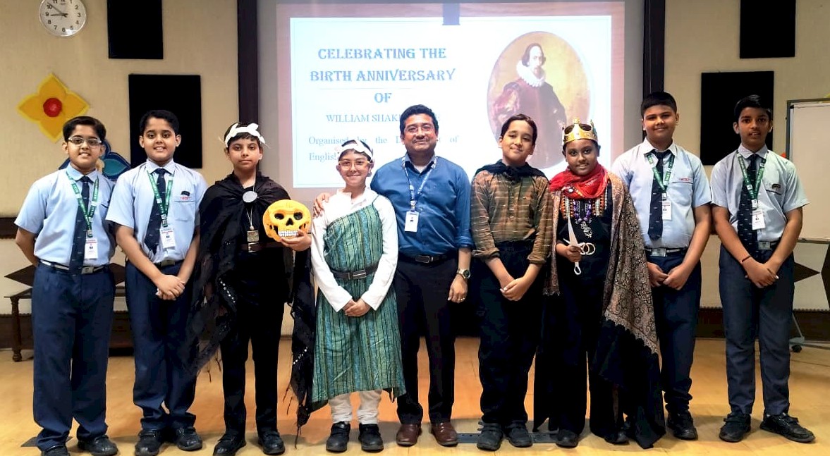 To pay tribute to the Bard of Avon, William Shakespeare, on his 462nd birth anniversary, the English Department organised a variety of innovative chart-making activities for the students of Class 9. The students of Classes 7 and 8 participated enthusiastically in a PowerPoint presentation, complemented by an engaging quiz session, and brought to life some of the iconic characters from Shakespearean plays through a Declamation Competition.