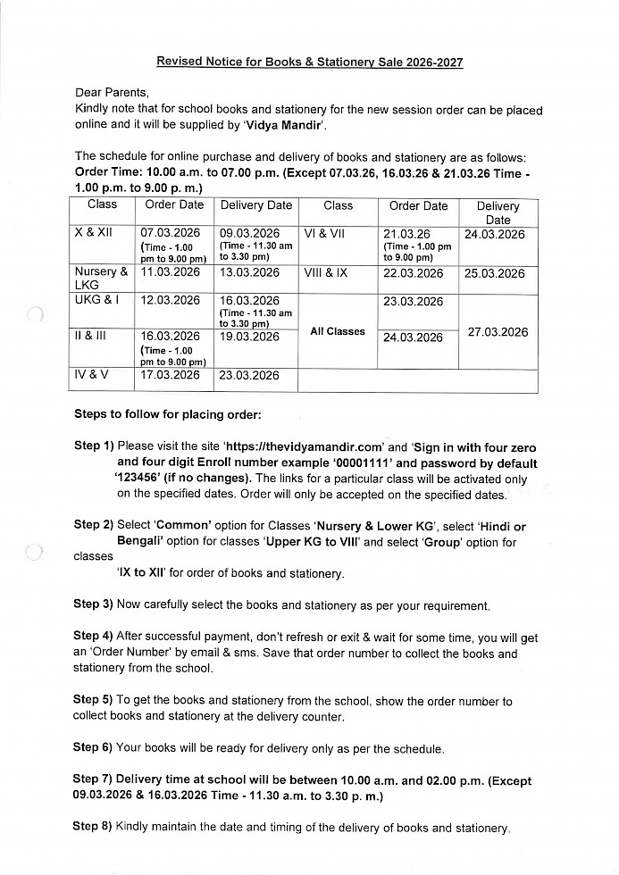 Notice for Books and Stationery Sale 2026-2027